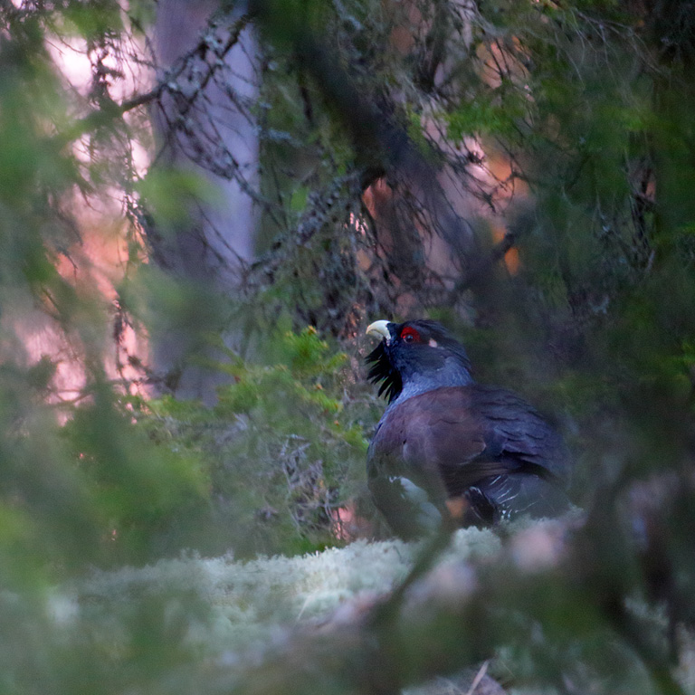 Around April 20 is the time to sleep in the forest to be able to witness the capercaillie lek. The cocks start to display already at 04:00 when it´s nearly dark, and the only thing you can see is their white wing knuckles. Later when the sun rise the display may be over if no hens appear.